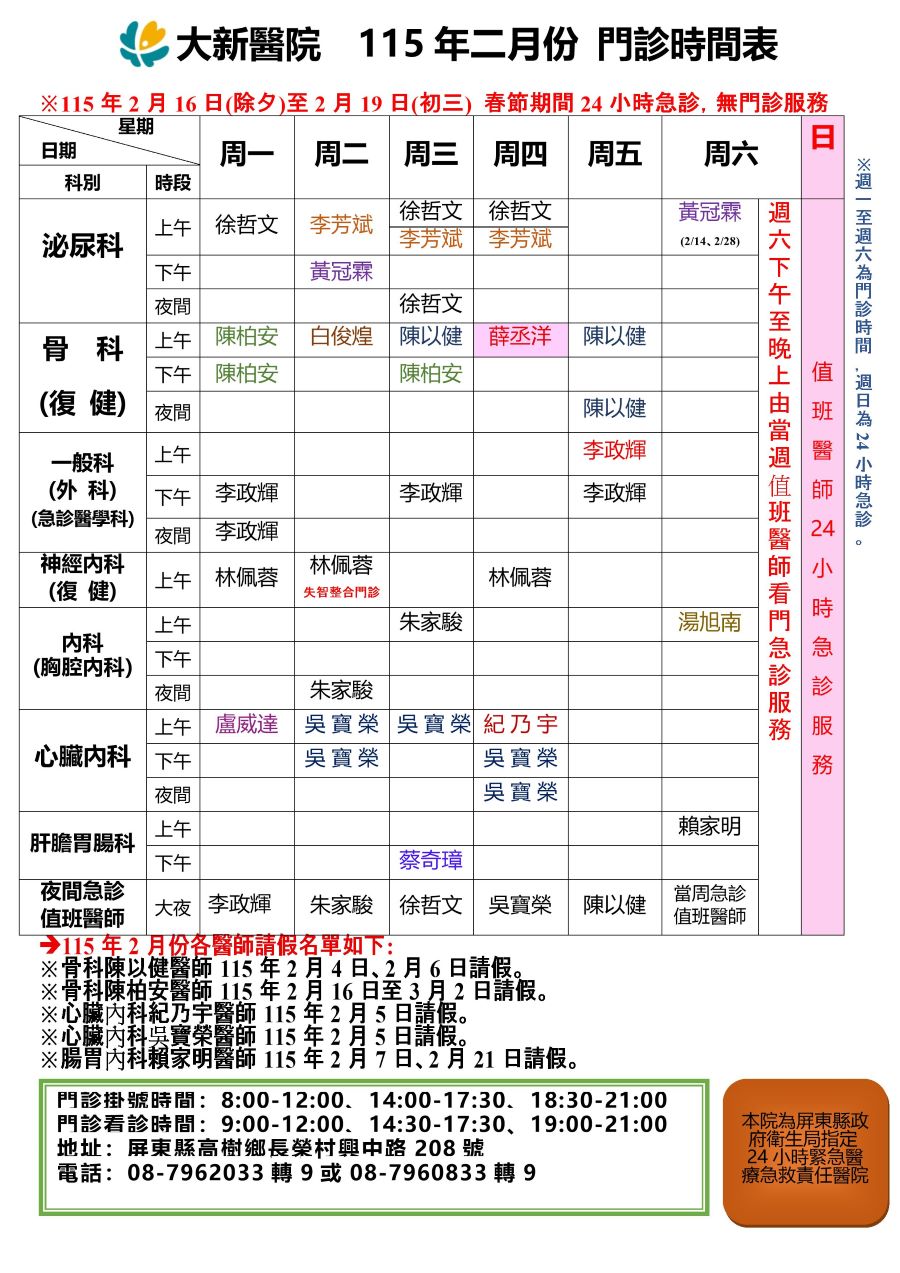 大新醫院大新醫院115年2月份門診表