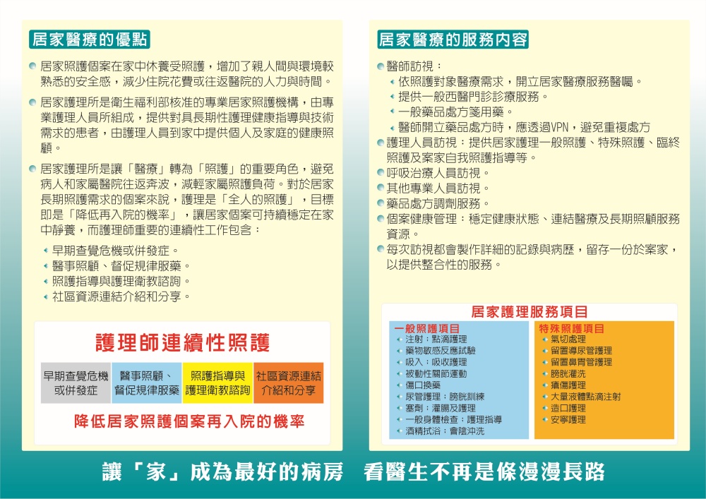 「全民健康保險居家醫療照護整合計畫」,由醫護人員組成居家整合照護團隊,主動走入長者或是行動不方便的患者家中,提供完整且持續的醫療照護。