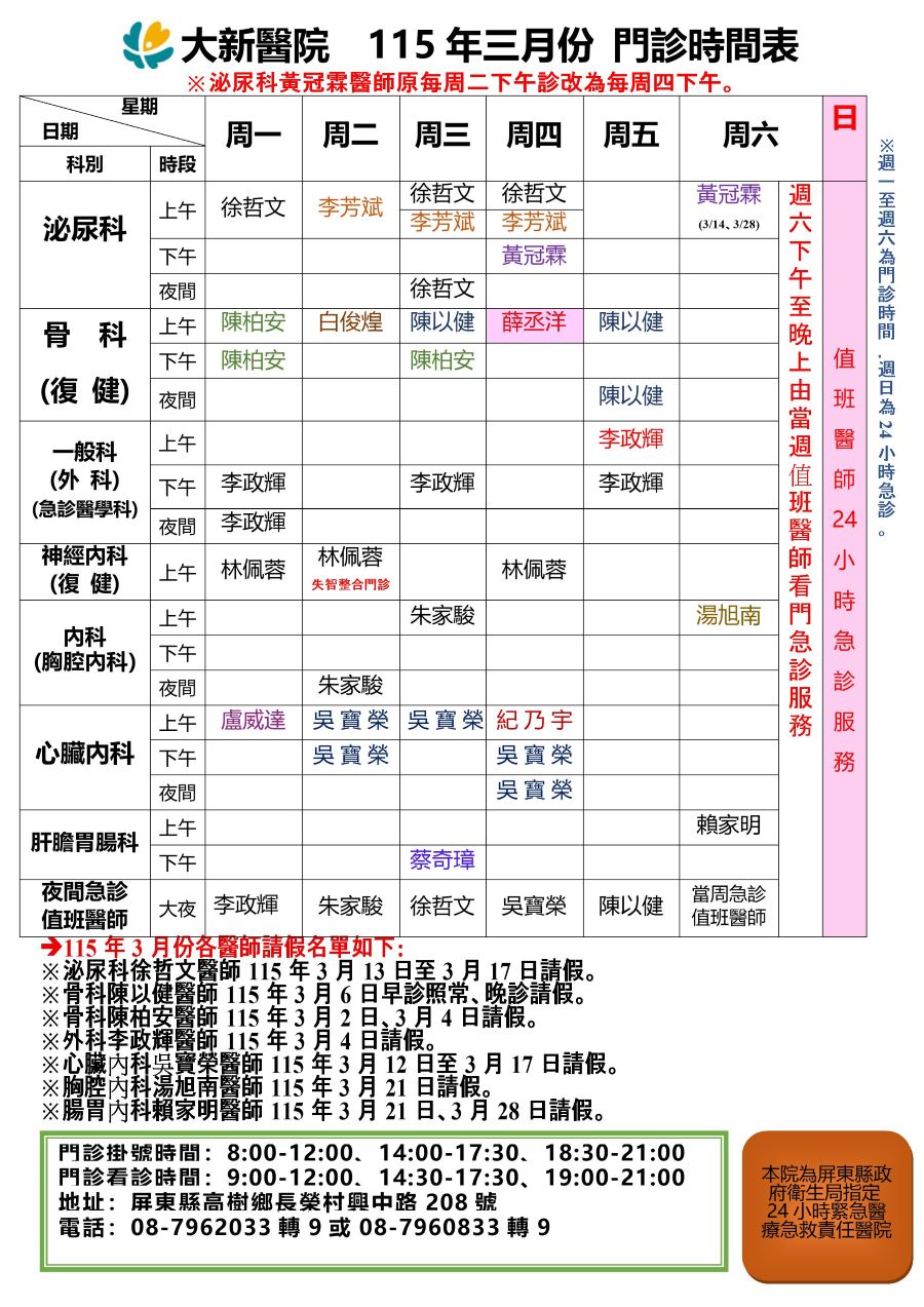 大新醫院大新醫院115年3月份門診表