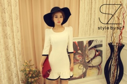 中袖拼接撞色荷葉邊擺連衣裙K-...