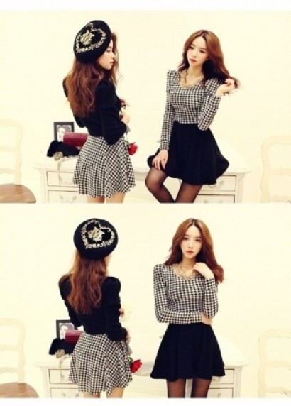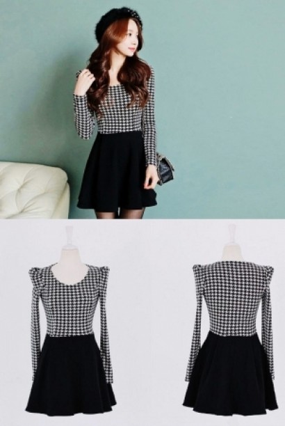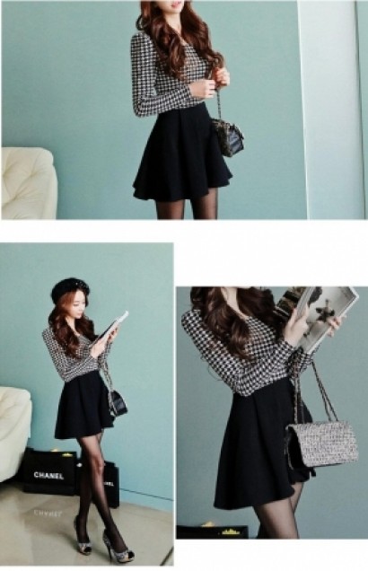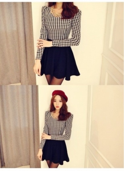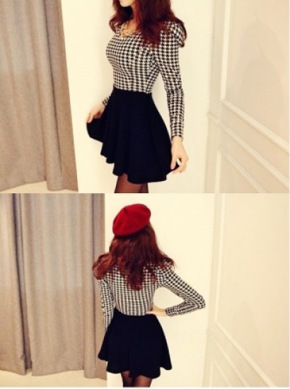 收腰修身千鳥紋連衣裙